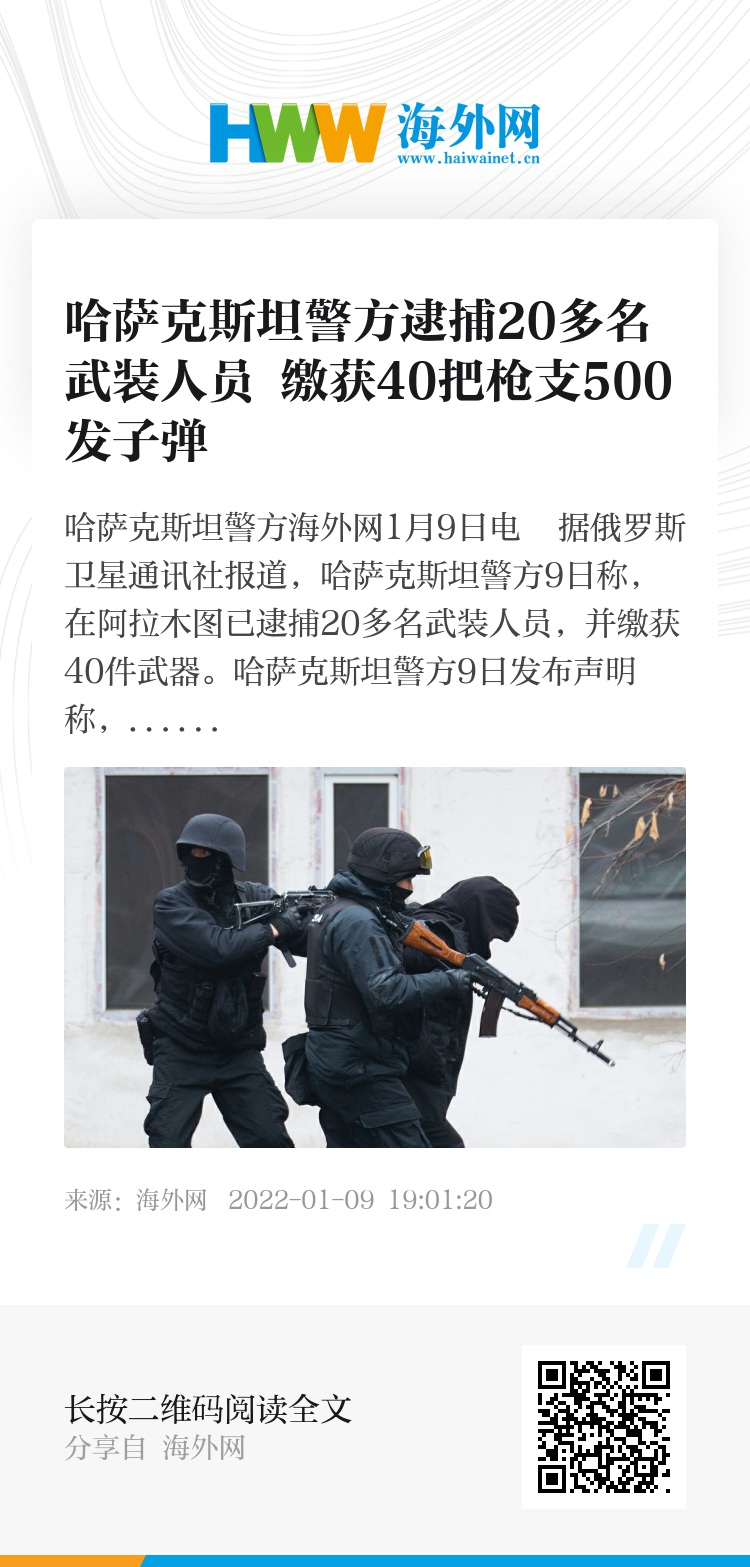 海外网1月9日电 据俄罗斯卫星通讯社报道,哈萨克斯坦警方9日称,在阿拉木图已逮捕20多名武装人员,并缴获40件武器。