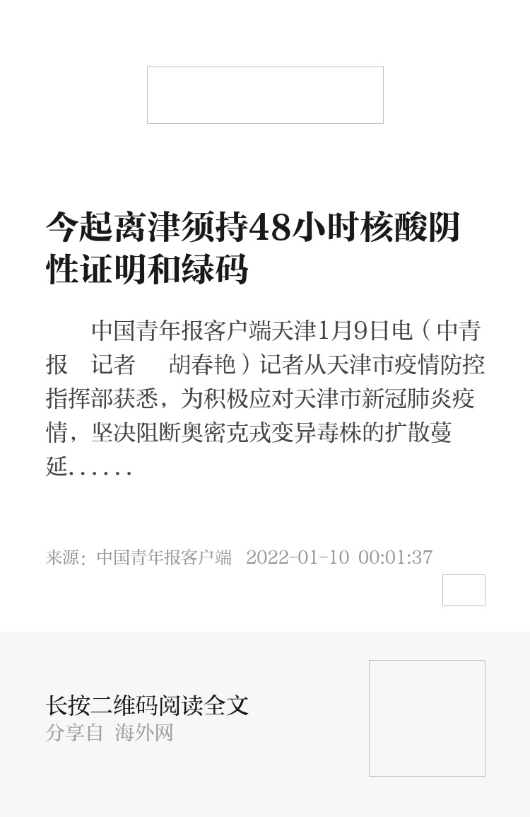 中国青年报客户端天津1月9日电(中青报・中青网记者 胡春艳)记者从天津市疫情防控指挥部获悉,为积极应对天津市新冠肺炎疫情,坚决阻断奥密克戎变异毒株的扩散蔓延,更好保障人民群众生命健康安全,依据《中华人民共和国传染病防治法》《中华人民共和国突发事件应对法》等法律法规,严格“非必要不离津”管理,确需离津的,自1月9日24时起,须持有48小时内核酸检测阴性证明和健康码绿码。