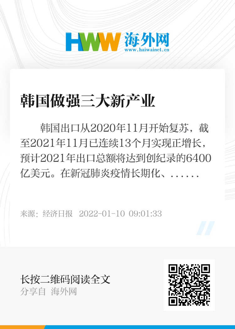 韩国出口从2020年11月开始复苏,截至2021年11月已连续13个月实现正增长,预计2021年出口总额将达到创纪录的6400亿美元。在新冠肺炎疫情长期化、产业链动荡加剧等困难条件下,新产业的持续高速增长对韩国出口起到了强劲支撑作用。系统半导体、生物健康、新能源汽车等最具未来增长潜力和就业拉动价值的韩国三大新产业,2021年度出口额均将刷新历史最高值。