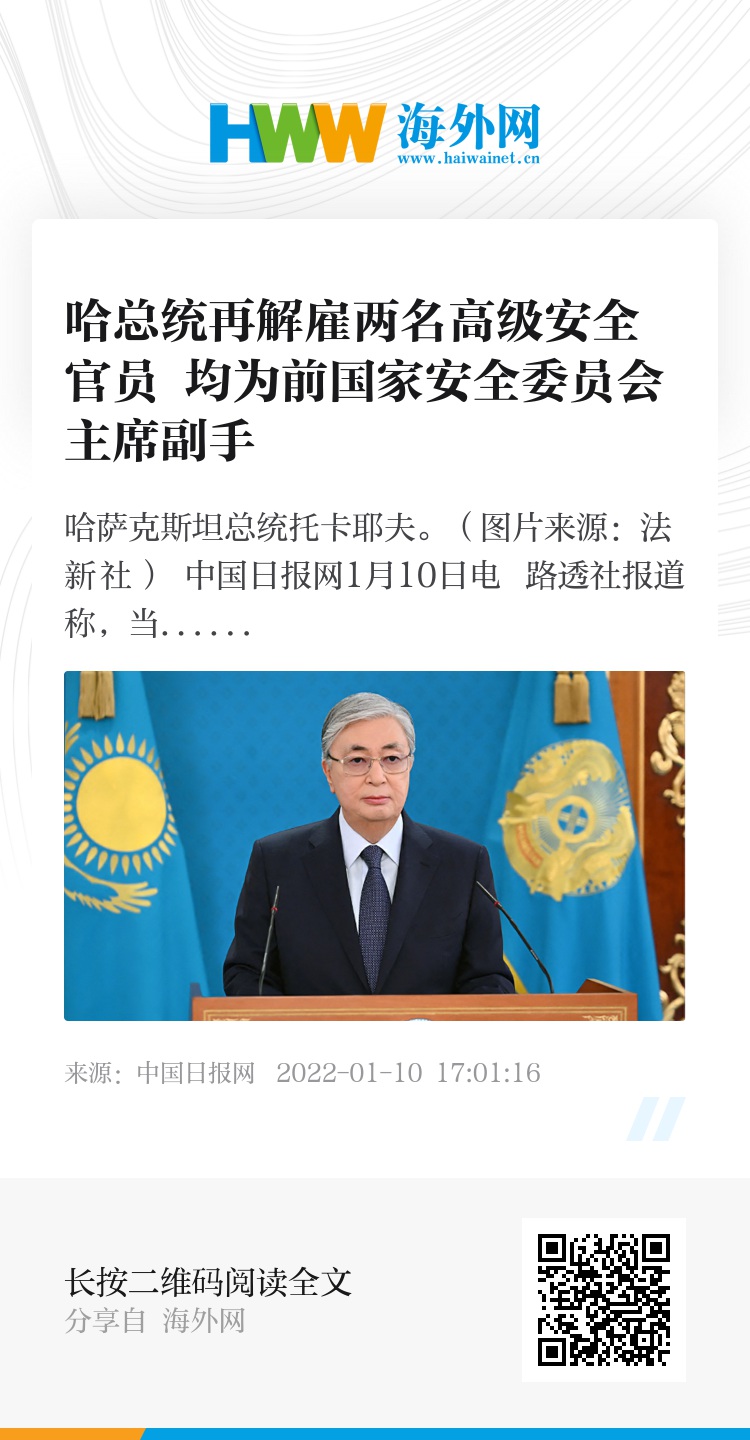 中国日报网1月10日电 路透社报道称,当地时间1月9日,哈萨克斯坦总统托卡耶夫又解雇了两名高级安全官员,均为前国家安全委员会安全部主席卡里姆·马西莫夫(Karim Massimov)的副手。此前,马西莫夫以及其他人员因涉嫌叛国罪被捕。
