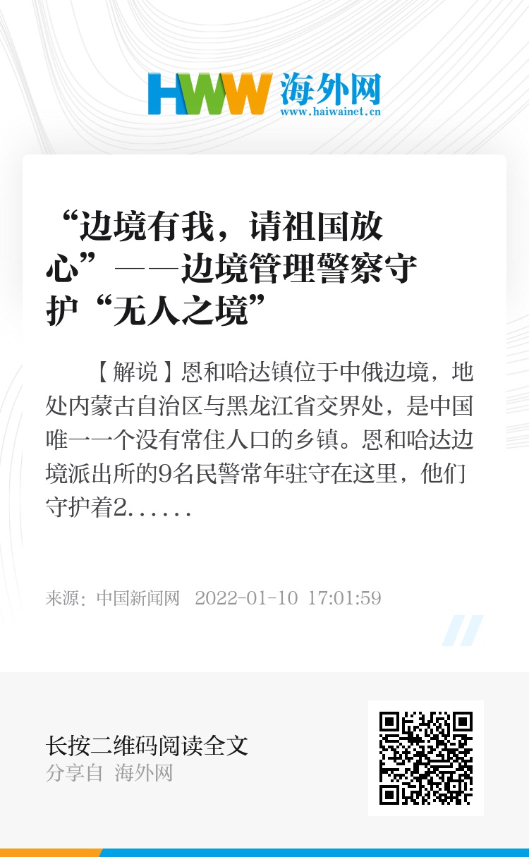 【解说】恩和哈达镇位于中俄边境,地处内蒙古自治区与黑龙江省交界处,是中国唯一一个没有常住人口的乡镇。恩和哈达边境派出所的9名民警常年驻守在这里,他们守护着216公里长的边境线和5895平方公里原始森林,负责当地边境管段巡逻防控、边境案件处理和地方治安案件的管辖。1月9日,恩和哈达地区的气温低至零下45摄氏度,边境派出所的民警们又一次踏雪出发,开始了一天的巡逻。有些路段积雪过多,车辆无法通行,民警们只能徒步前进,寒风刺骨,不多时面罩上已结满了冰花。这条道路是当地通往黑龙江省的唯一通道,为了方便车辆通行,民警们用随身携带的工具,凿冰开路。