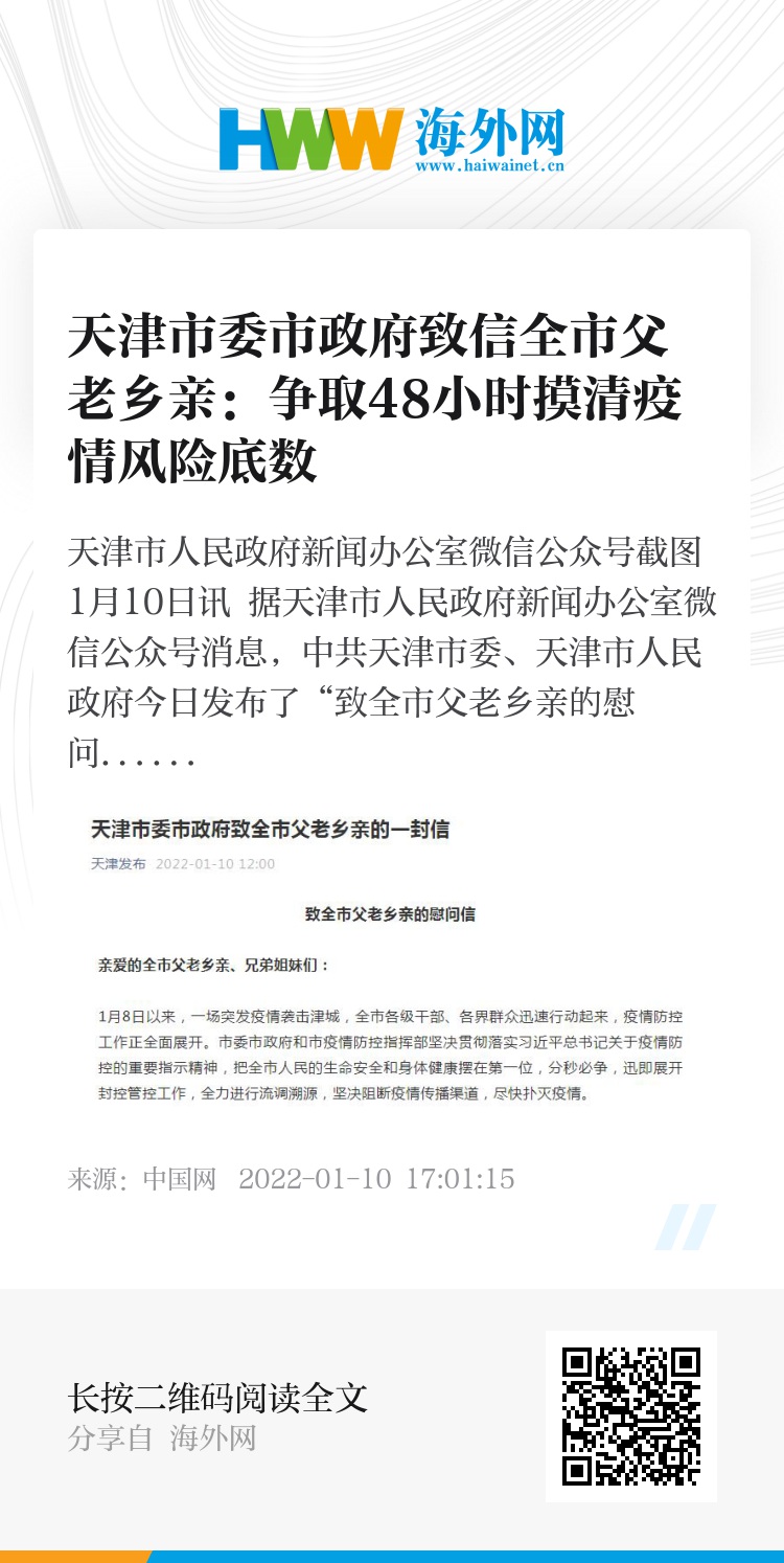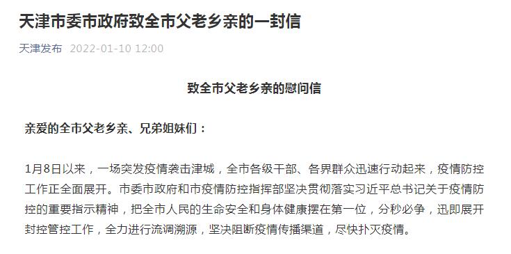 中国网1月10日讯 据天津市人民政府新闻办公室微信公众号消息,中共天津市委、天津市人民政府今日发布了“致全市父老乡亲的慰问信”。信中指出,此次疫情病毒属于奥密克戎变异株,传播速度、隐匿性、穿透力都不同以往。从8日深夜至9日凌晨,天津市疫情防控领导小组和指挥部召开紧急会议决定,在全市范围内开展全员核酸筛查,统筹全市人力物力和设备资源,争取用48小时左右时间,全面摸清疫情风险底数,消除病毒传播的潜在风险。