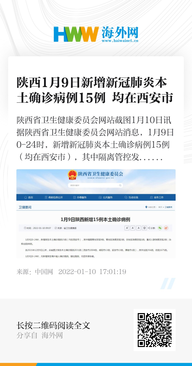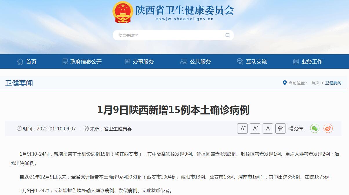 中国网1月10日讯 据陕西省卫生健康委员会网站消息,1月9日0-24时,新增新冠肺炎本土确诊病例15例(均在西安市),其中隔离管控发现9例、管控区筛查发现3例、封控区筛查发现1例、重点人群筛查发现2例;治愈出院88例。