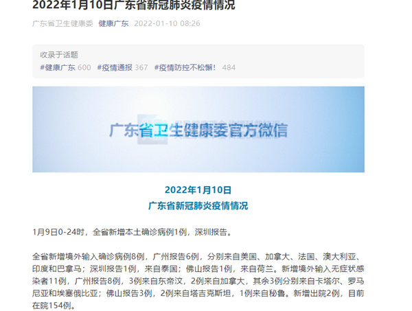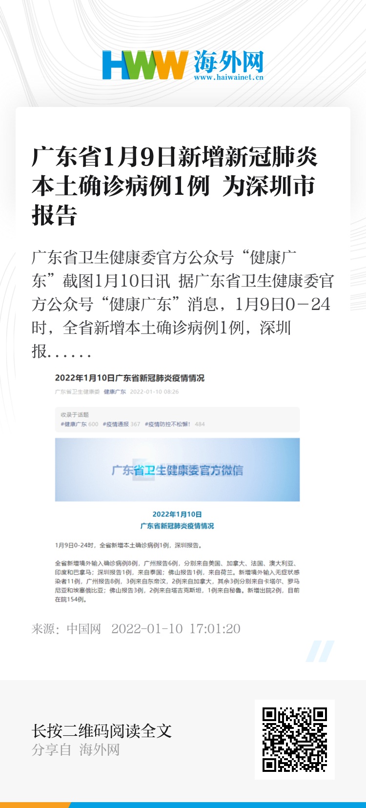 中国网1月10日讯 据广东省卫生健康委官方公众号“健康广东”消息,1月9日0-24时,全省新增本土确诊病例1例,深圳报告。