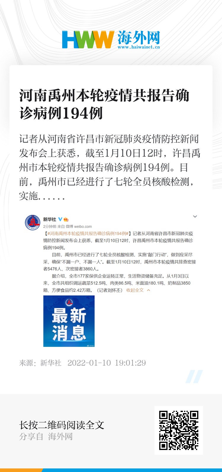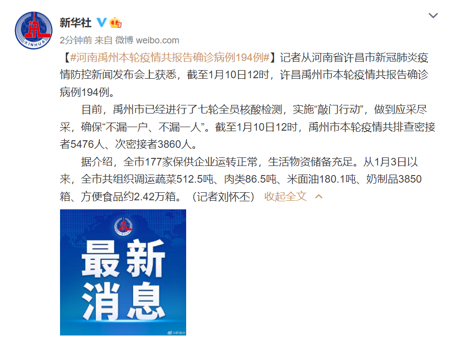 记者从河南省许昌市新冠肺炎疫情防控新闻发布会上获悉,截至1月10日12时,许昌禹州市本轮疫情共报告确诊病例194例。