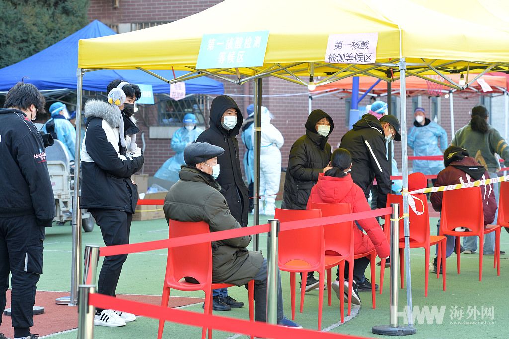 2022年1月10日,天津市和平区居民到鞍山道小学核酸检测点进行核酸检测,为缓解居民等候疲劳该检测点准备了椅子和板凳,既可以当一米线保证安全距离又可以让等候居民坐下休息。(图:视觉中国)