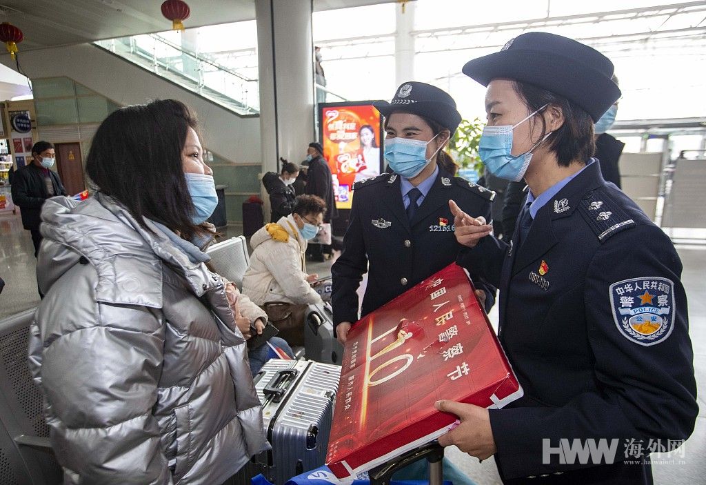 2022年1月10日,在泰州站候车室,民警与旅客采用抽盲盒的方式开展法律法规知识竞赛互动。(图:视觉中国)