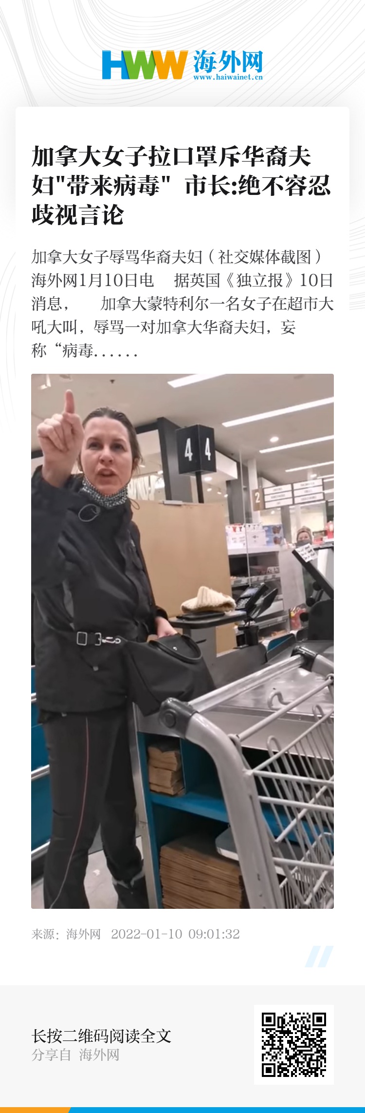 海外网1月10日电 据英国《独立报》10日消息, 加拿大蒙特利尔一名女子在超市大吼大叫,辱骂一对加拿大华裔夫妇,妄称“病毒都是你们带来的”。骂人时还专门把口罩拉下。这名女子后被警察带走,蒙特利尔市市长已发声,对此事表示“震惊且不可接受”,并谴责其涉种族歧视言论。