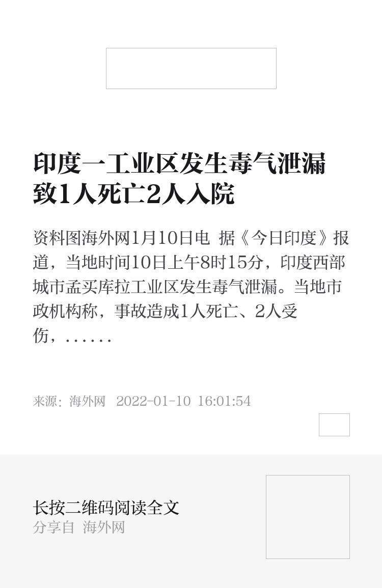 海外网1月10日电 据《今日印度》报道,当地时间10日上午8时15分,印度西部城市孟买库拉工业区发生毒气泄漏。当地市政机构称,事故造成1人死亡、2人受伤,目前伤者正在医院接受治疗。