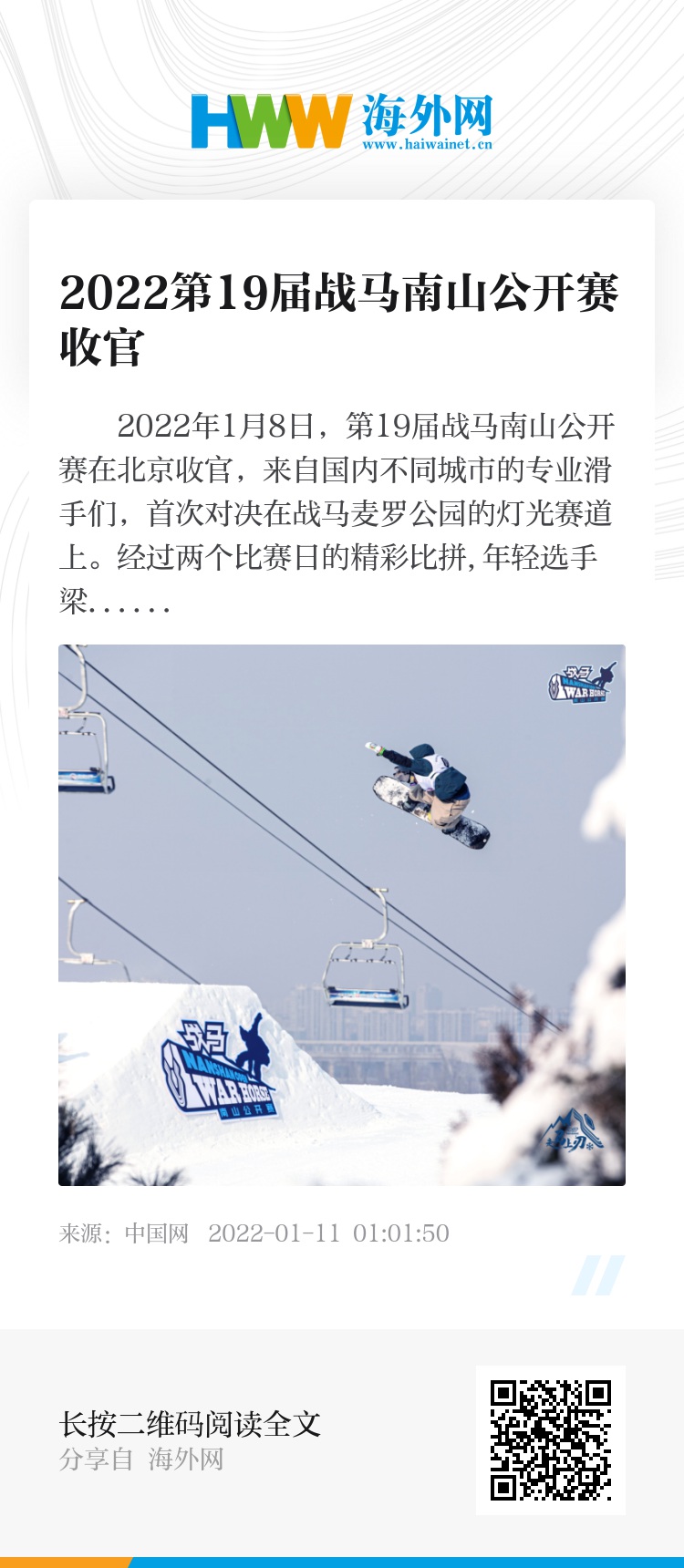 2022年1月8日,第19届战马南山公开赛在北京收官,来自国内不同城市的专业滑手们,首次对决在战马麦罗公园的灯光赛道上。经过两个比赛日的精彩比拼,年轻选手梁硕凭借决赛最后一轮在两组跳台上做出了外转720和内转900,以76.00的全场最高分夺得第19届战马南山公开赛的冠军,李寒、惠义宁分别以71.66分、64.33分获得亚军和季军。