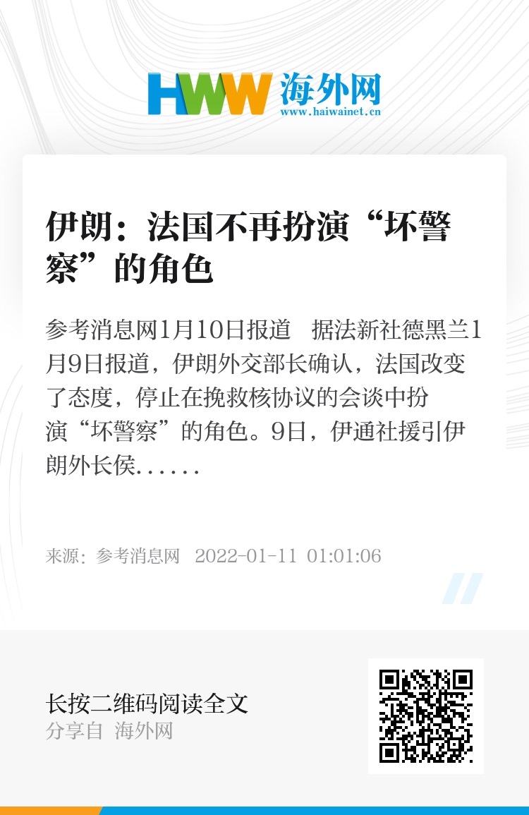 参考消息网1月10日报道 据法新社德黑兰1月9日报道,伊朗外交部长确认,法国改变了态度,停止在挽救核协议的会谈中扮演“坏警察”的角色。