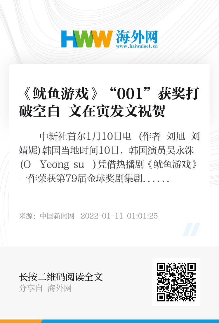 中新社首尔1月10日电 (作者 刘旭 刘婧妮)韩国当地时间10日,韩国演员吴永洙(O Yeong-su )凭借热播剧《鱿鱼游戏》一作荣获第79届金球奖剧集剧情类最佳男配角奖。韩国总统文在寅发文祝贺,并将此誉为韩国文化无限潜力的象征。