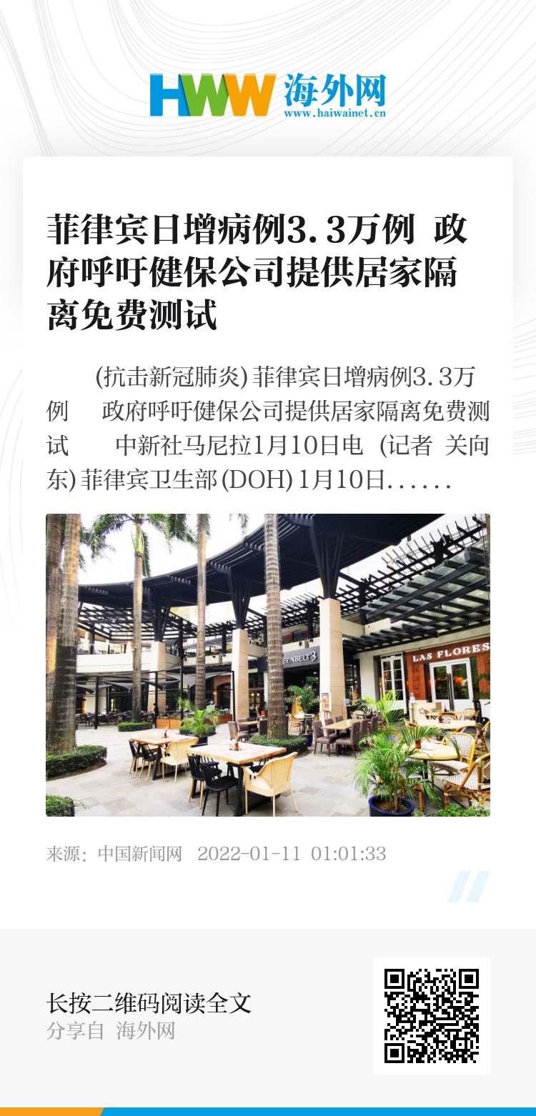 (抗击新冠肺炎)菲律宾日增病例3.3万例 政府呼吁健保公司提供居家隔离免费测试