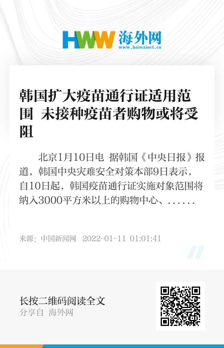 中新网北京1月10日电 据韩国《中央日报》报道,韩国中央灾难安全对策本部9日表示,自10日起,韩国疫苗通行证实施对象范围将纳入3000平方米以上的购物中心、大型超市、百货商店、农水产品流通中心等流通产业发展法上的“大规模店铺”,共计2300余家。