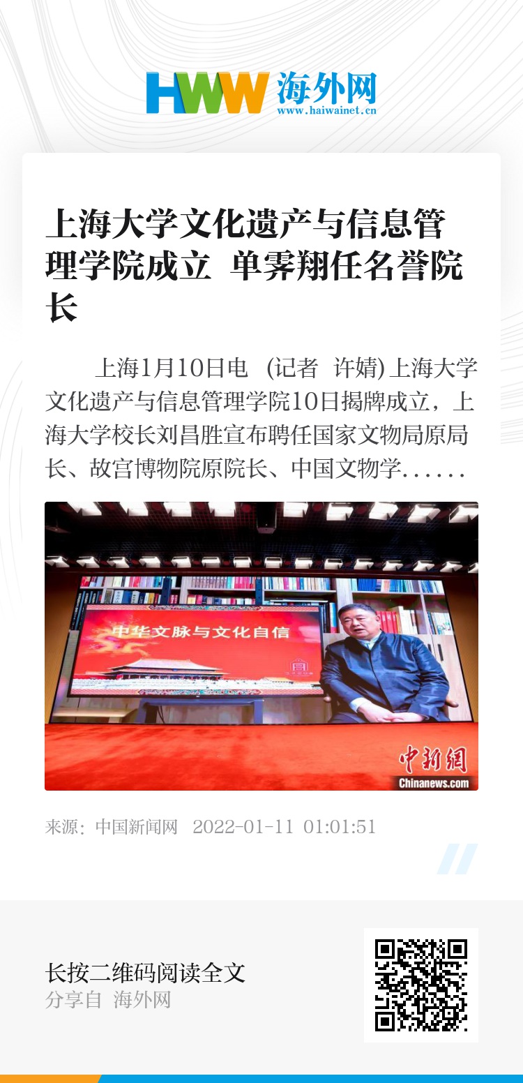 中新网上海1月10日电 (记者 许婧)上海大学文化遗产与信息管理学院10日揭牌成立,上海大学校长刘昌胜宣布聘任国家文物局原局长、故宫博物院原院长、中国文物学会会长单霁翔为文化遗产与信息管理学院名誉院长,丁华东担任党委书记,黄继忠担任院长,金波为学术带头人。