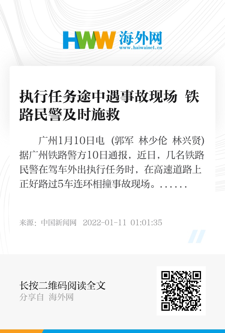 约10分钟后,高速公路路政工作人员到达现场,三名铁路民警见没有人员伤亡情况后,与路政人员进行沟通,在明确对方不需要协助后,三名铁路民警上车离开了现场,继续执行原定任务。(完)