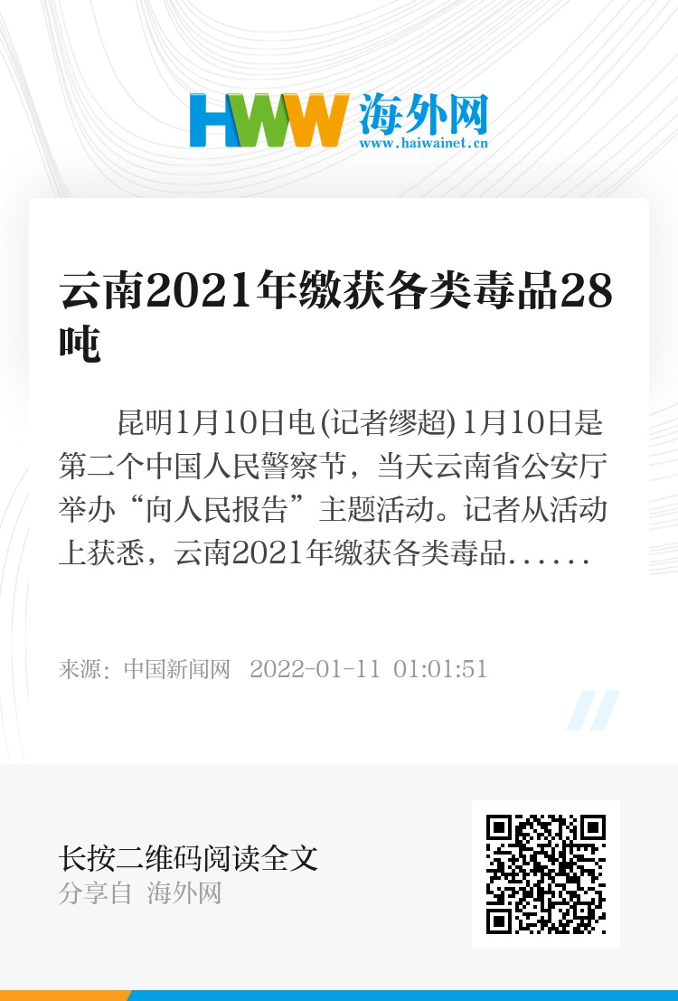中新网昆明1月10日电(记者缪超)1月10日是第二个中国人民警察节,当天云南省公安厅举办“向人民报告”主题活动。记者从活动上获悉,云南2021年缴获各类毒品28吨、制毒物品3750余吨。