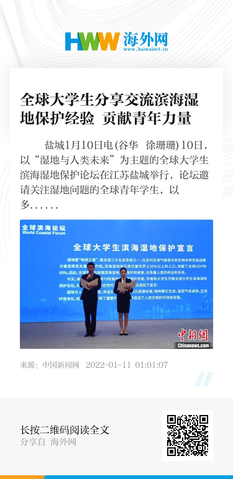作为新时代青年,应该勇担时代责任,坚定践行生命共同体的理念,努力为人与自然和谐共生贡献青年力量……论坛现场,来自全球高校湿地领域的专家、学者和大学生共同发布《全球大学生滨海湿地保护宣言》。