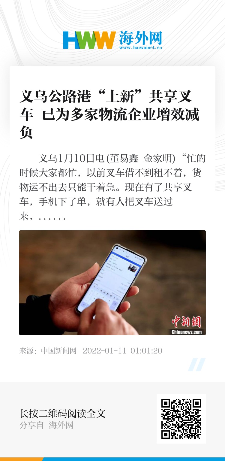 中新网义乌1月10日电(董易鑫 金家明)“忙的时候大家都忙,以前叉车借不到租不着,货物运不出去只能干着急。现在有了共享叉车,手机下了单,就有人把叉车送过来,用完之后还有人来取走,效率大大提升。”10日,义乌市国内公路港经营户王勇说。