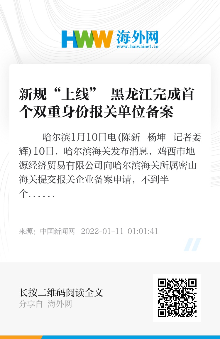 中新网哈尔滨1月10日电(陈新 杨坤 记者姜辉)10日,哈尔滨海关发布消息,鸡西市地源经济贸易有限公司向哈尔滨海关所属密山海关提交报关企业备案申请,不到半个小时便完成报关企业、进出口收发货人双重身份备案。这是海关报关单位备案管理新规定“上线”以来,哈尔滨海关完成的首个双重身份报关单位备案。