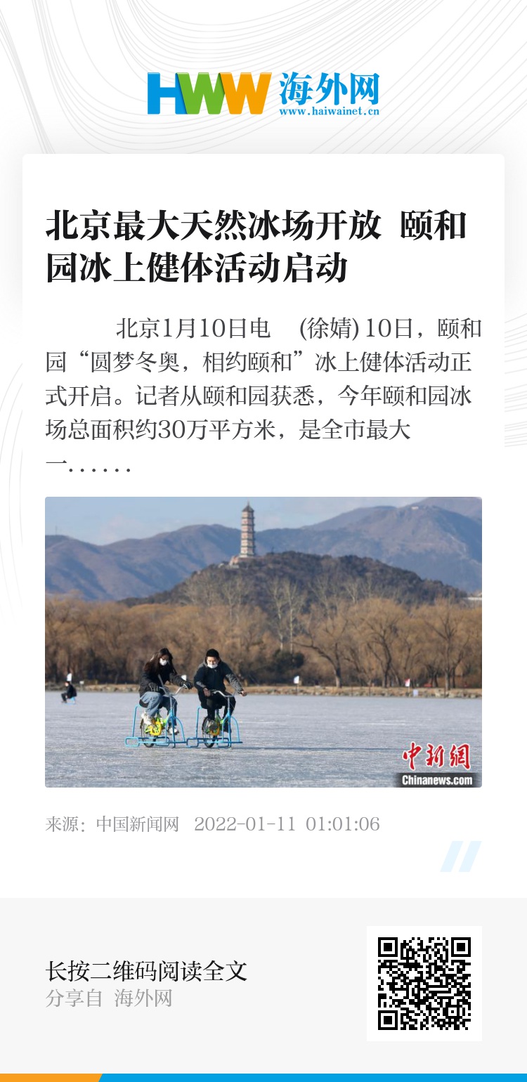中新网北京1月10日电 (徐婧)10日,颐和园“圆梦冬奥,相约颐和”冰上健体活动正式开启。记者从颐和园获悉,今年颐和园冰场总面积约30万平方米,是全市最大一处天然冰场。预计开放时间为2022年1月10日至2022年2月4日,每日开放时间为8:30—17:00(16:00止票)。