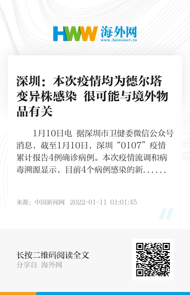 中新网1月10日电 据深圳市卫健委微信公众号消息,截至1月10日,深圳“0107”疫情累计报告4例确诊病例。本次疫情流调和病毒溯源显示,目前4个病例感染的新冠病毒均为德尔塔变异株(AY.103进化分支),且100%同源。