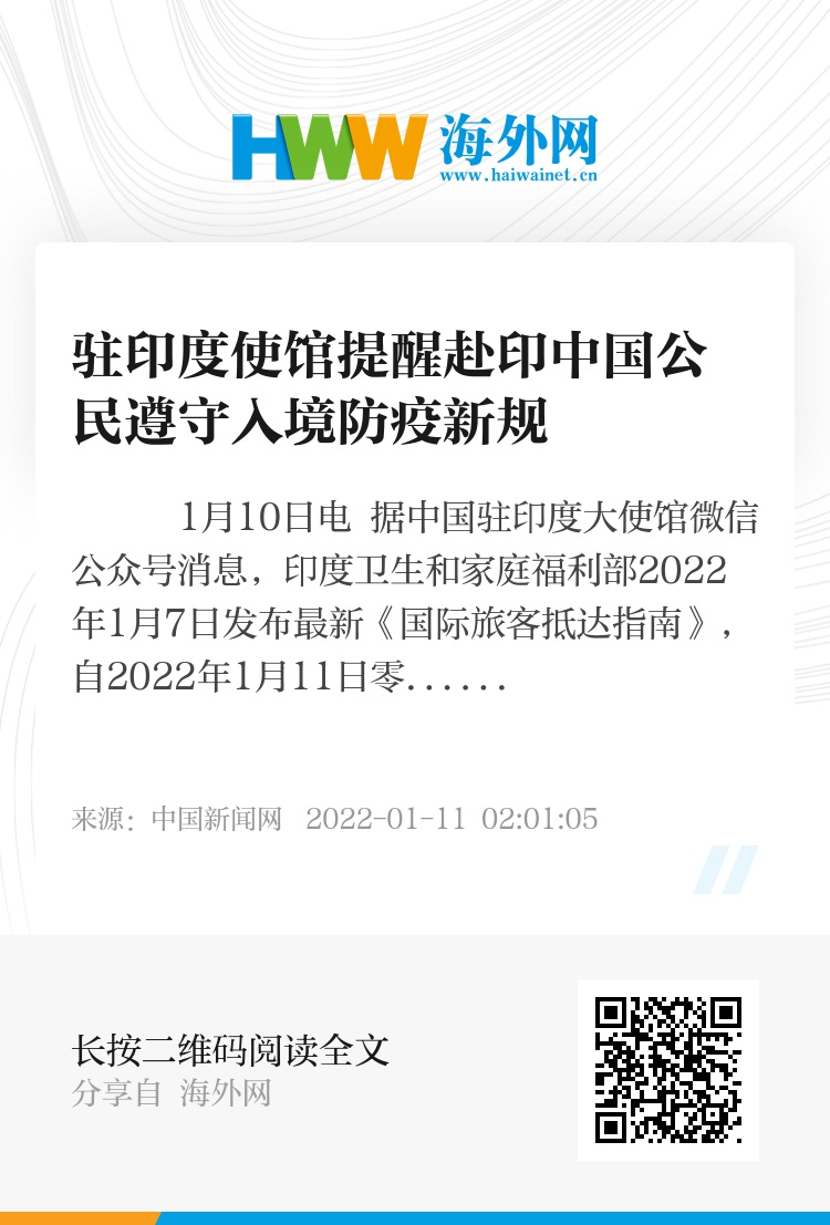中国驻印度大使馆谨提醒赴印中国公民坚持“非必要、非紧急、不旅行”。如确需出行,请合理安排行程,加强自身安全防护,密切关注并遵守印方入境防疫新规定,避免造成不便及经济损失。