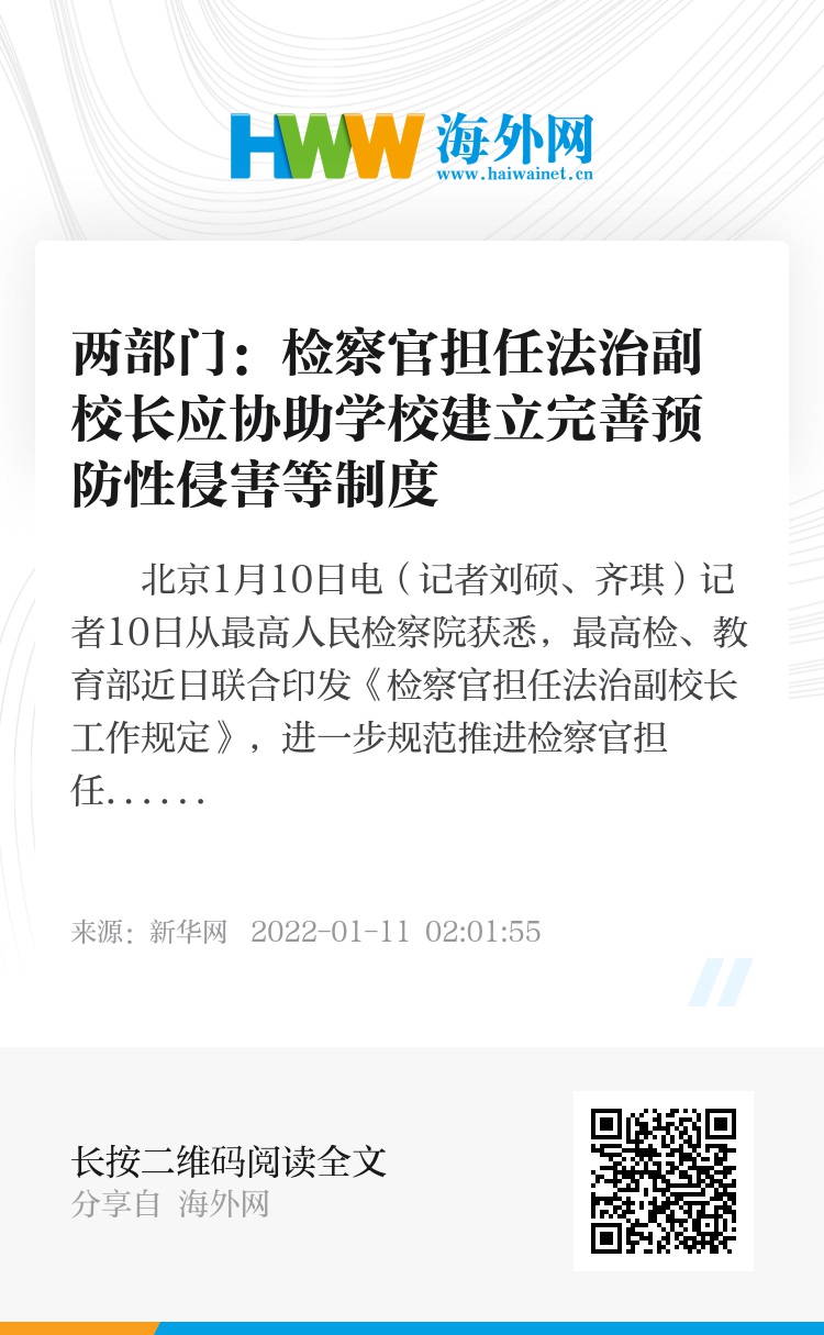 新华社北京1月10日电(记者刘硕、齐琪)记者10日从最高人民检察院获悉,最高检、教育部近日联合印发《检察官担任法治副校长工作规定》,进一步规范推进检察官担任法治副校长工作,自2022年1月1日起施行。