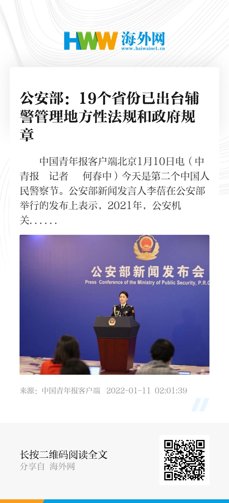 中国青年报客户端北京1月10日电(中青报・中青网记者 何春中)今天是第二个中国人民警察节。公安部新闻发言人李蓓在公安部举行的发布上表示,2021年,公安机关不断深化人民警察管理制度改革,有力提升广大民警职业荣誉感和工作积极性,19个省份出台辅警管理地方性法规和政府规章,推动了队伍专业化、制度化、法治化、规范化建设。