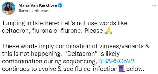晚些时候,世卫组织卫生紧急项目技术负责人玛利亚·范凯尔克霍弗也针对这一问题在社交媒体发文,她同样认为,之所以会出现“德尔塔克戎”,很可能是实验室在测序过程中发生了污染,并呼吁不要再使用“德尔塔克戎”的叫法。
