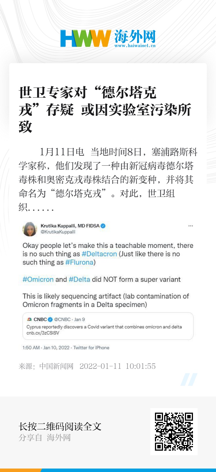 中新网1月11日电 当地时间8日,塞浦路斯科学家称,他们发现了一种由新冠病毒德尔塔毒株和奥密克戎毒株结合的新变种,并将其命名为“德尔塔克戎”。对此,世卫组织专家10日发文质疑,并称这一情况可能是因为实验室污染所致。