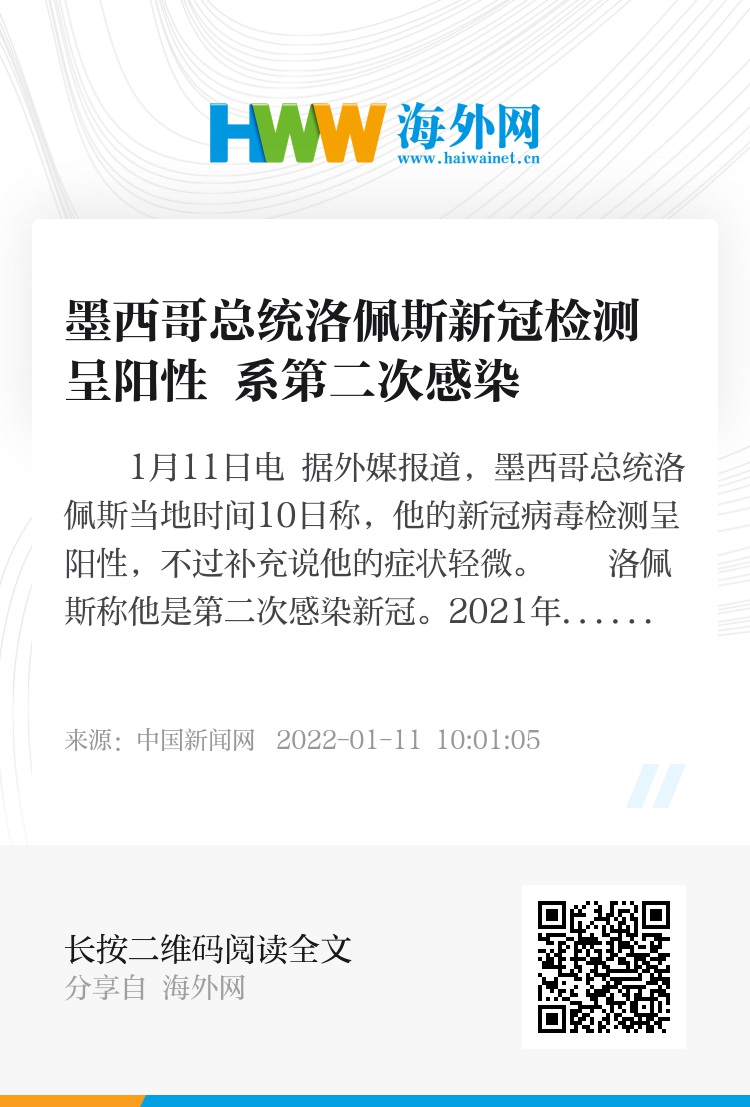 中新网1月11日电 据外媒报道,墨西哥总统洛佩斯当地时间10日称,他的新冠病毒检测呈阳性,不过补充说他的症状轻微。