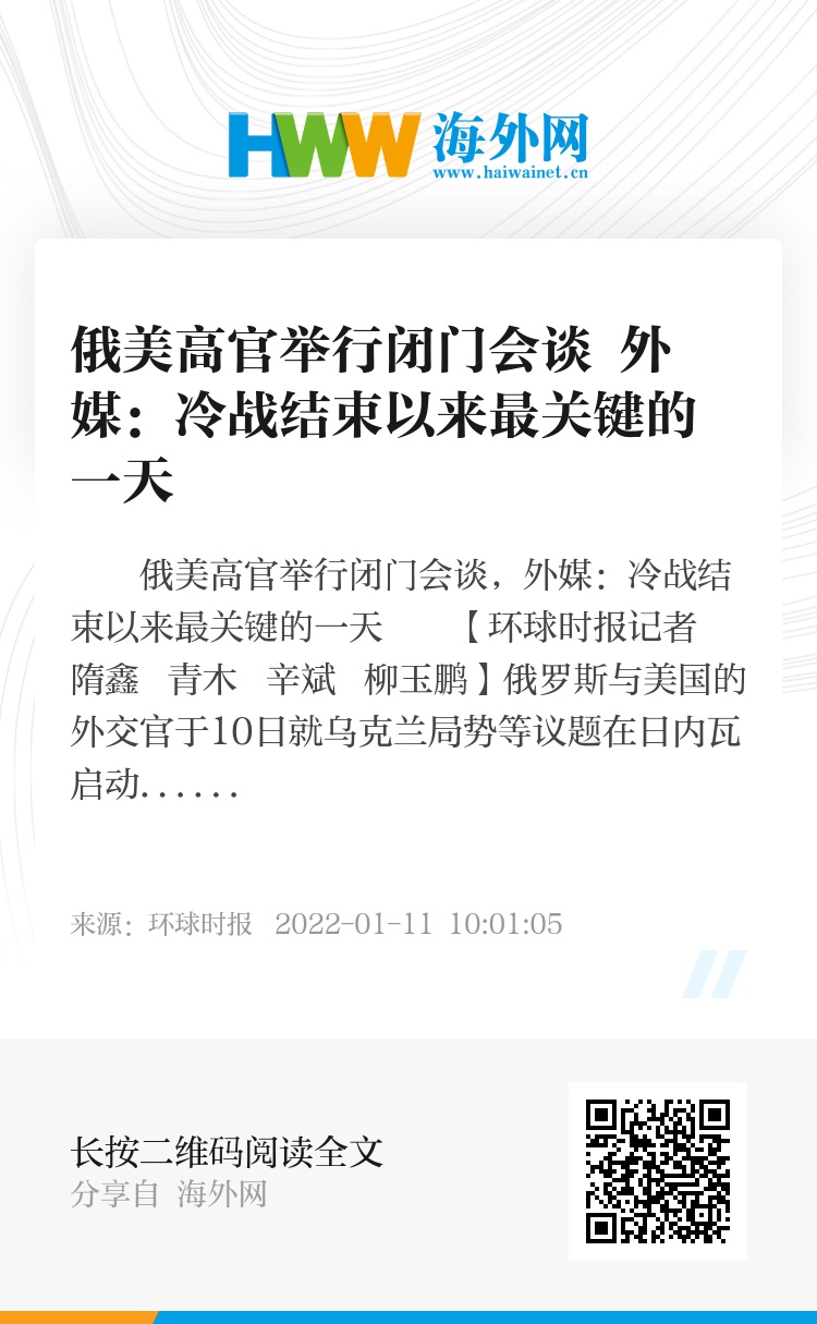 【环球时报记者 隋鑫 青木 辛斌 柳玉鹏】俄罗斯与美国的外交官于10日就乌克兰局势等议题在日内瓦启动闭门会谈,这是去年确立战略稳定对话机制后的第三轮会晤。这也是本周俄与西方3场系列会谈的第一场,其他两场将先后在欧洲另外两座城市举行。有媒体形容称,这是“冷战结束以来最关键的一天”,过去时代的“危险插曲”成为本周全球外交的前沿和焦点,而未来的欧洲安全很大程度上取决于这些会谈。但由于俄罗斯与西方互相提出的要求不相容,想取得显著成果并不乐观。会谈进行之际,华盛顿继续高举制裁“大棒”,莫斯科则明言“不会让步”。俄副外长里亚布科夫表示美方“对我们的需求缺乏了解”,美国务卿布林肯称“未来一周,我们不会看到任何突破”。给会谈增加变数的还有哈萨克斯坦发生的暴乱。在美国,有人认为俄罗斯出兵哈萨克斯坦帮助平息内乱发出了一个清晰信号,意味着莫斯科更渴望对乌克兰做某些事情。哈萨克斯坦和乌克兰都是原苏联加盟共和国。尽管普京曾明言“重建苏联”“毫无意义且不可能”,美媒及高官却大力炒作起这个话题来。