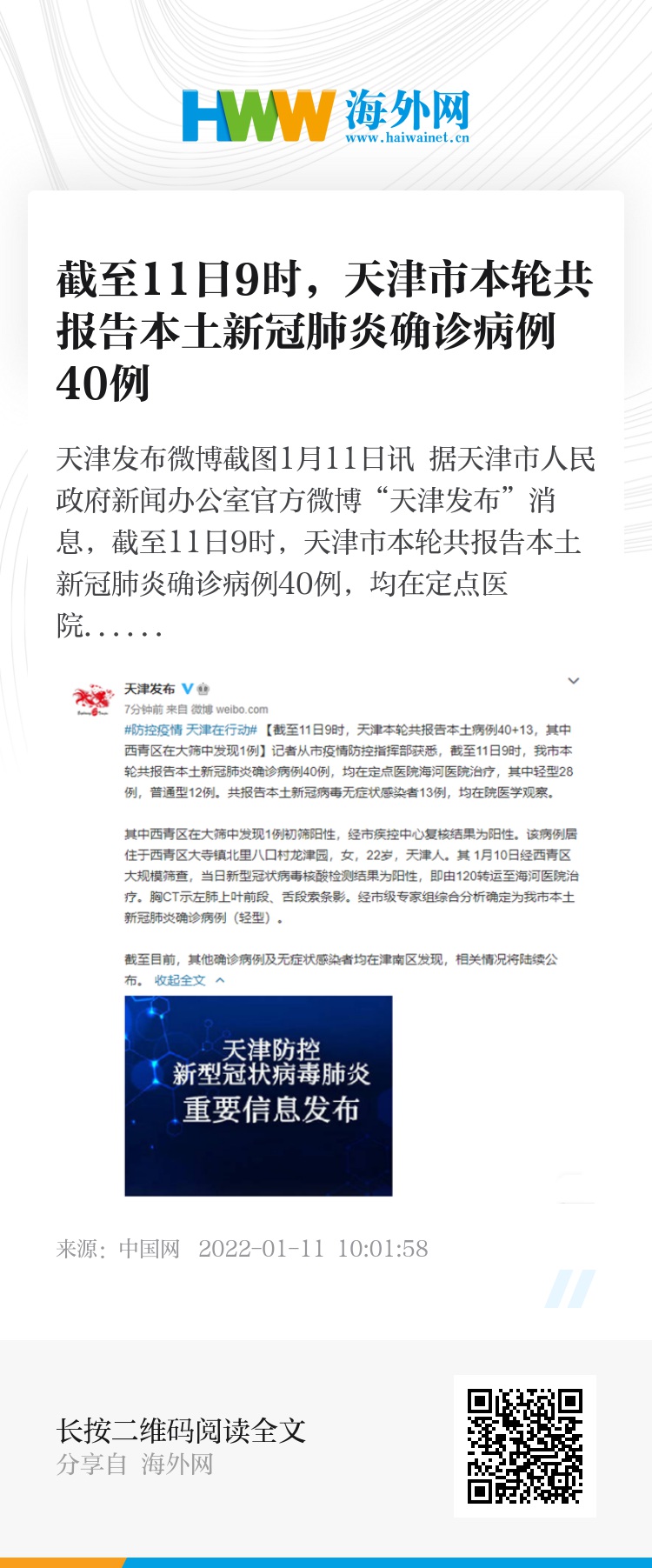 中国网1月11日讯 据天津市人民政府新闻办公室官方微博“天津发布”消息,截至11日9时,天津市本轮共报告本土新冠肺炎确诊病例40例,均在定点医院海河医院治疗,其中轻型28例,普通型12例。共报告本土新冠病毒无症状感染者13例,均在院医学观察。