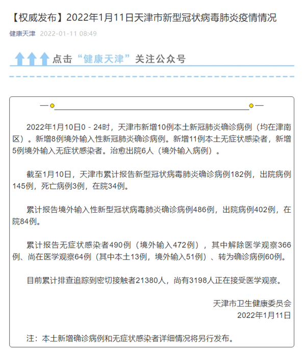 中国网1月11日讯 据天津市卫健委官方微信公众号“健康天津”消息,2022年1月10日0-24时,天津市新增10例本土新冠肺炎确诊病例(均在津南区)。新增8例境外输入性新冠肺炎确诊病例。新增11例本土无症状感染者,新增5例境外输入无症状感染者。治愈出院6人(境外输入病例)。
