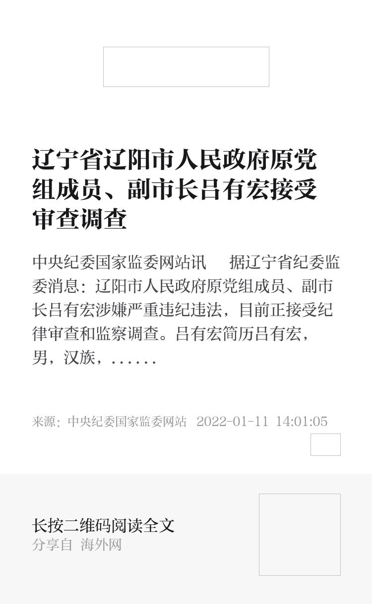 中央纪委国家监委网站讯 据辽宁省纪委监委消息:辽阳市人民政府原党组成员、副市长吕有宏涉嫌严重违纪违法,目前正接受纪律审查和监察调查。