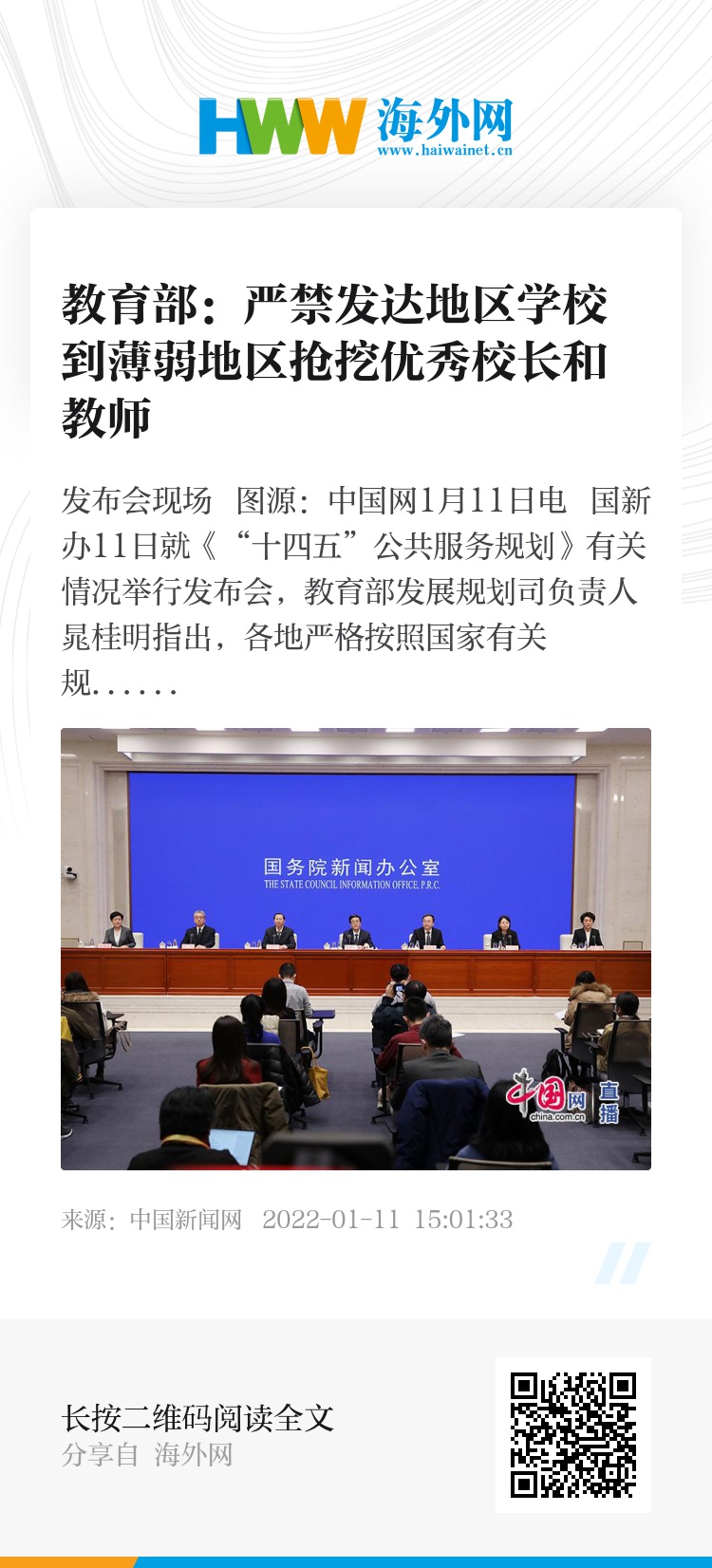 中新网1月11日电 国新办11日就《“十四五”公共服务规划》有关情况举行发布会,教育部发展规划司负责人晁桂明指出,各地严格按照国家有关规定和程序办理教师流动手续,严禁发达地区、城区学校到薄弱地区、县中抢挖优秀校长和教师。