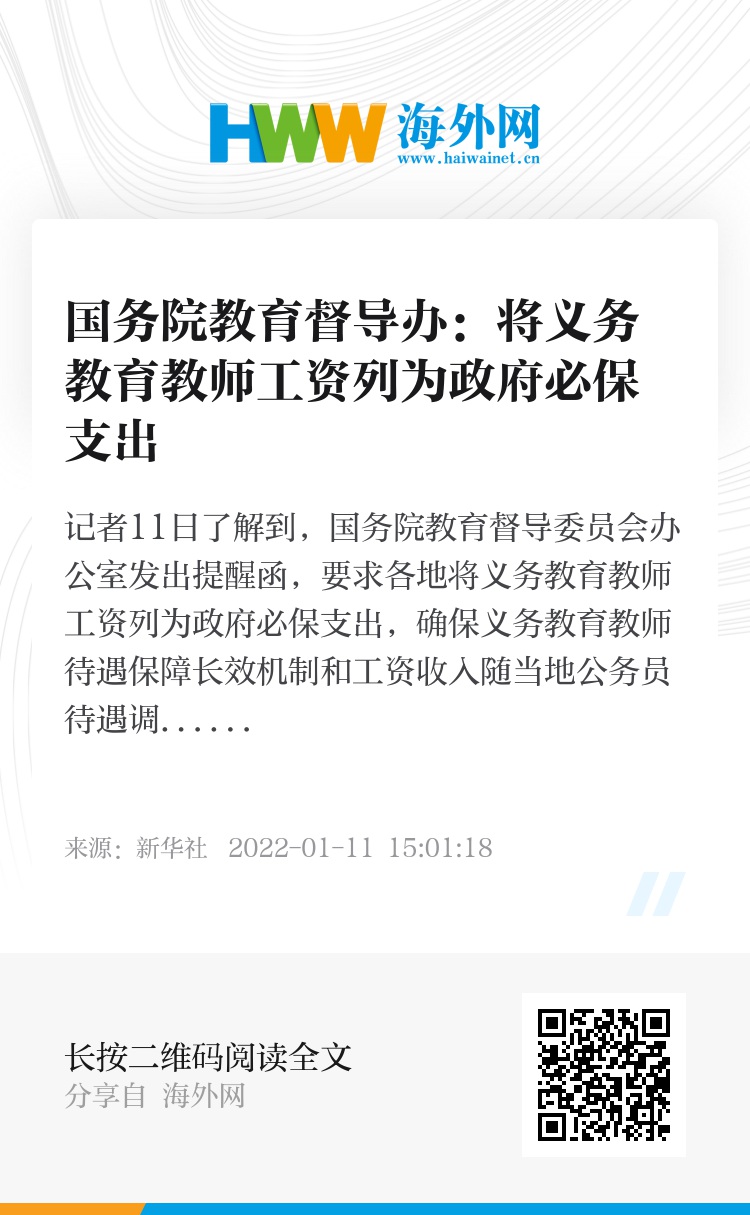记者11日了解到,国务院教育督导委员会办公室发出提醒函,要求各地将义务教育教师工资列为政府必保支出,确保义务教育教师待遇保障长效机制和工资收入随当地公务员待遇调整的联动机制落到实处,落实义务教育教师平均工资收入水平不低于当地公务员政策。在发放2021年年终奖励性补贴及安排2022年度财政预算时,确保“不低于”持续落实落地。(记者胡浩)