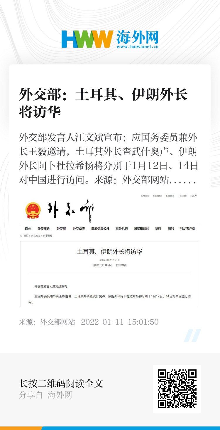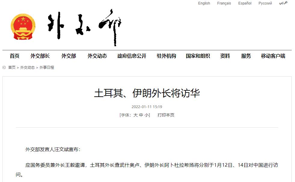 应国务委员兼外长王毅邀请,土耳其外长查武什奥卢、伊朗外长阿卜杜拉希扬将分别于1月12日、14日对中国进行访问。