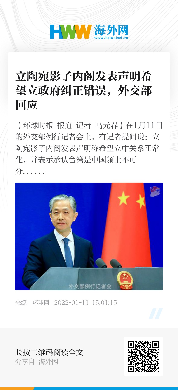 【环球时报-环球网报道 记者 乌元春】在1月11日的外交部例行记者会上,有记者提问说:立陶宛影子内阁发表声明称希望立中关系正常化,并表示承认台湾是中国领土不可分割的一部分,希望立政府纠正错误,将“台湾驻立代表处”改名为“台北代表处”。请问中方对此有何评论?