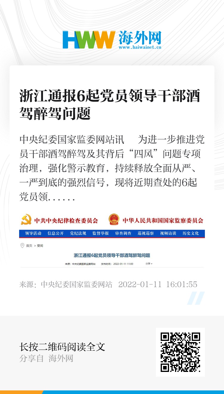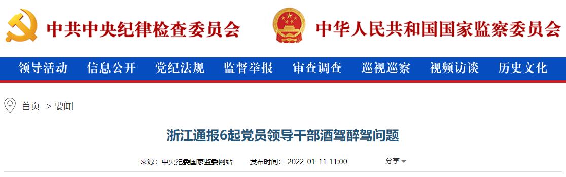 中央纪委国家监委网站讯 为进一步推进党员干部酒驾醉驾及其背后“四风”问题专项治理,强化警示教育,持续释放全面从严、一严到底的强烈信号,现将近期查处的6起党员领导干部饮酒、醉酒后驾驶机动车问题通报如下。