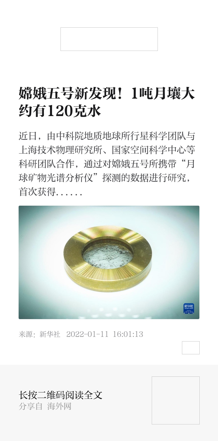 近日,由中科院地质地球所行星科学团队与上海技术物理研究所、国家空间科学中心等科研团队合作,通过对嫦娥五号所携带“月球矿物光谱分析仪”探测的数据进行研究,首次获得了月表原位条件下的水含量。最新研究显示,1吨月壤中大约有120克水,1吨岩石中大约有180克水。结合样品分析,月壤中的水绝大部分是来自于太阳风的贡献,岩石中多出来的水则可能代表了月球内部水。科研团队介绍,光谱仪所探测到的水指矿物里的水分子或者羟基,在一定条件下才能转化为可以喝的水。(记者胡喆、张泉)