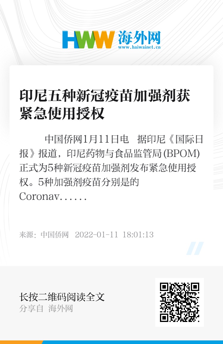 中国侨网1月11日电 据印尼《国际日报》报道,印尼药物与食品监管局(BPOM)正式为5种新冠疫苗加强剂发布紧急使用授权。5种加强剂疫苗分别是的Coronavac、辉瑞(Pfizer),阿斯利康(AstraZeneca)、莫德纳(Moderna),以及智飞疫苗(Zifivax)。