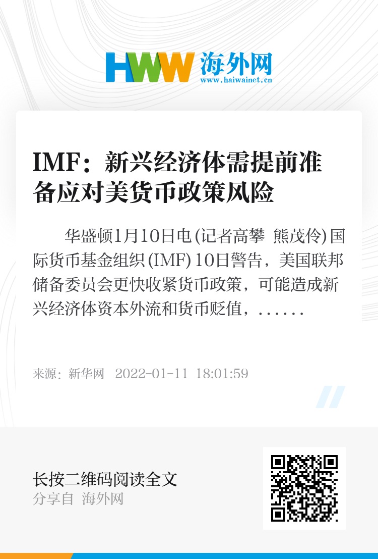 新华社华盛顿1月10日电(记者高攀 熊茂伶)国际货币基金组织(IMF)10日警告,美国联邦储备委员会更快收紧货币政策,可能造成新兴经济体资本外流和货币贬值,新兴经济体应提前做好政策准备。