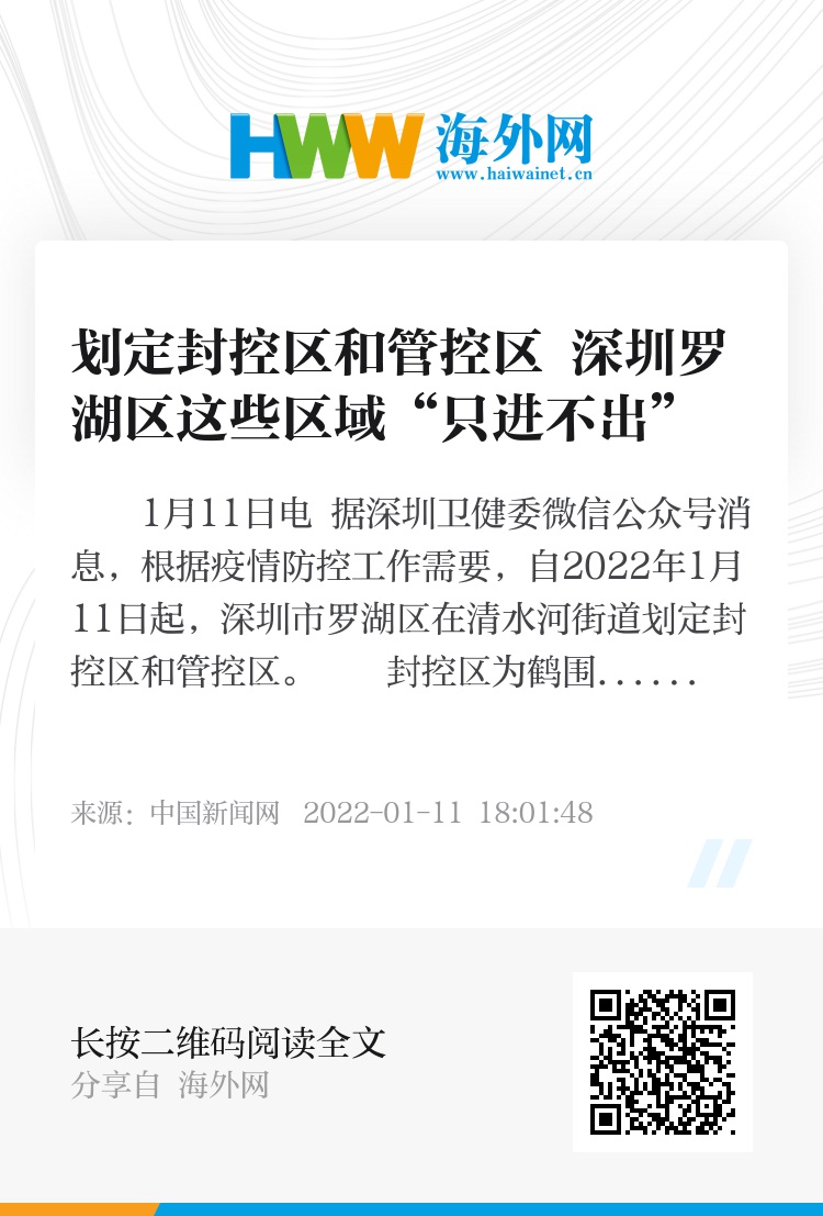 中新网1月11日电 据深圳卫健委微信公众号消息,根据疫情防控工作需要,自2022年1月11日起,深圳市罗湖区在清水河街道划定封控区和管控区。