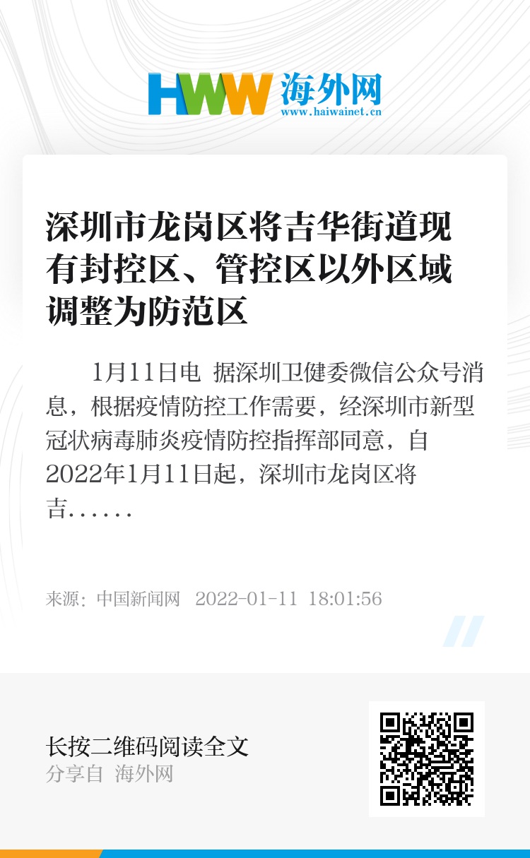 中新网1月11日电 据深圳卫健委微信公众号消息,根据疫情防控工作需要,经深圳市新型冠状病毒肺炎疫情防控指挥部同意,自2022年1月11日起,深圳市龙岗区将吉华街道现有封控区、管控区以外区域调整为防范区,至此,布吉、坂田、吉华街道除封控区、管控区外区域均为防范区,并进一步加强全区相关场所防控措施。