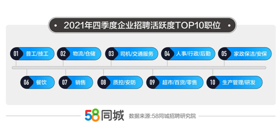 根据58同城招聘研究院数据,2021年四季度,成渝地区得益于经济高速发展的势头,企业招聘需求位列前茅;另外,经过一年的调整与建设,武汉、长沙企业的招聘需求大量释放,长沙较疫情前的2019年增长33.40%。从职位上看,企业招聘活跃度TOP10的职位分别为:普工/技工、物流/仓储、司机/交通服务、人事/行政/后勤、家政保洁/安保、餐饮、销售、质控/安防、超市/百货/零售、生产管理/研发。同比来看,得益于疫情防控效果良好与线上消费激增,跨区域运输不但恢复疫情前水平且稳中有增,相关物流/仓储、司机/交通服务类职位的招聘需求呈现大幅增长。