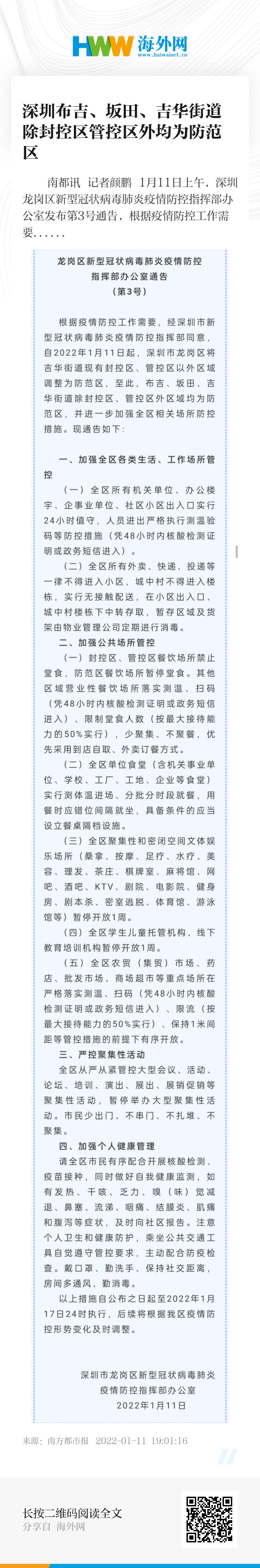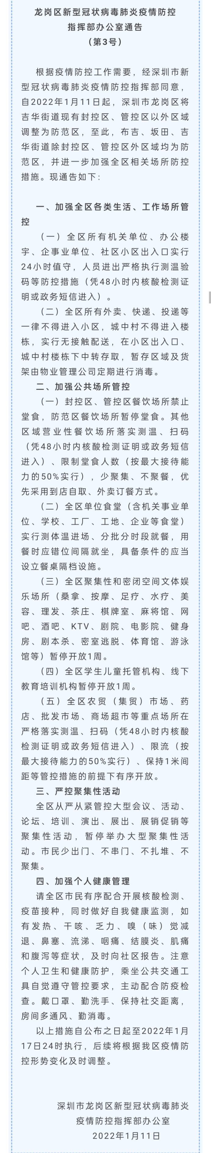 南都讯 记者颜鹏 1月11日上午,深圳龙岗区新型冠状病毒肺炎疫情防控指挥部办公室发布第3号通告,根据疫情防控工作需要,经深圳市新型冠状病毒肺炎疫情防控指挥部同意,自2022年1月11日起,深圳市龙岗区将吉华街道现有封控区、管控区以外区域调整为防范区。至此,布吉、坂田、吉华街道除封控区、管控区外区域均为防范区。通告具体内容如下: