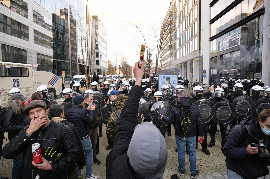 比利时数千人抗议新冠防疫规定 警方包围接近欧盟总部人群