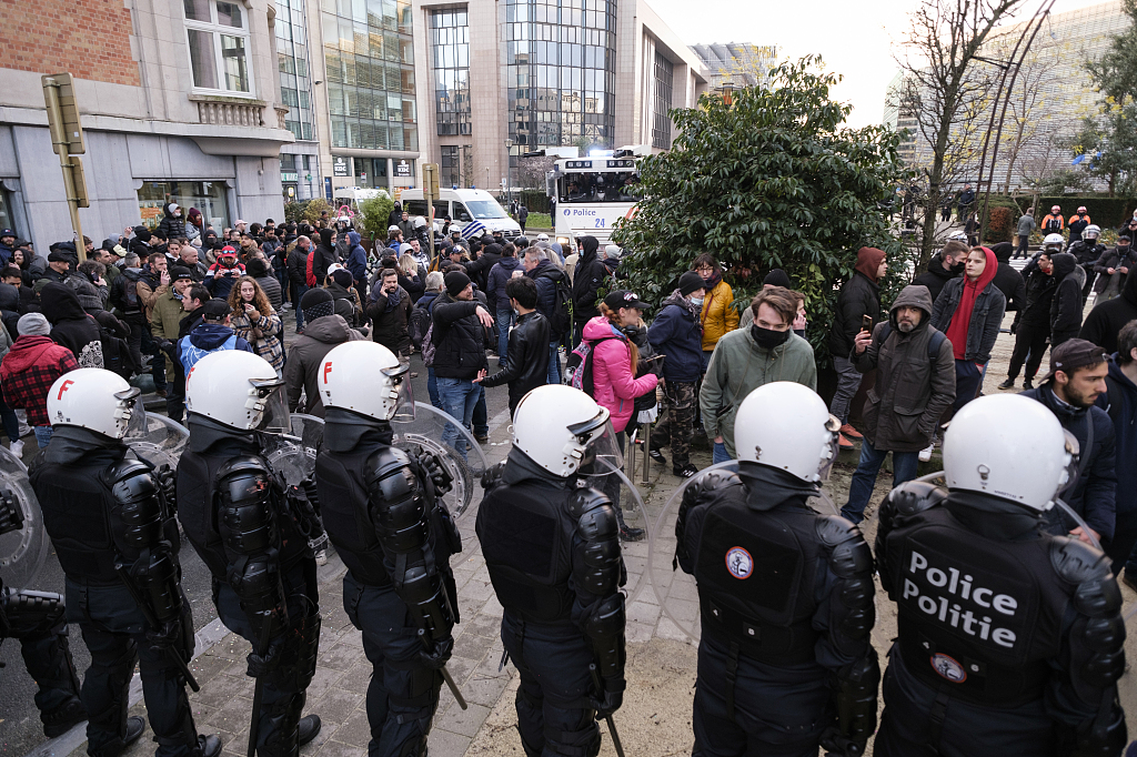 比利时数千人抗议新冠防疫规定 警方包围接近欧盟总部人群